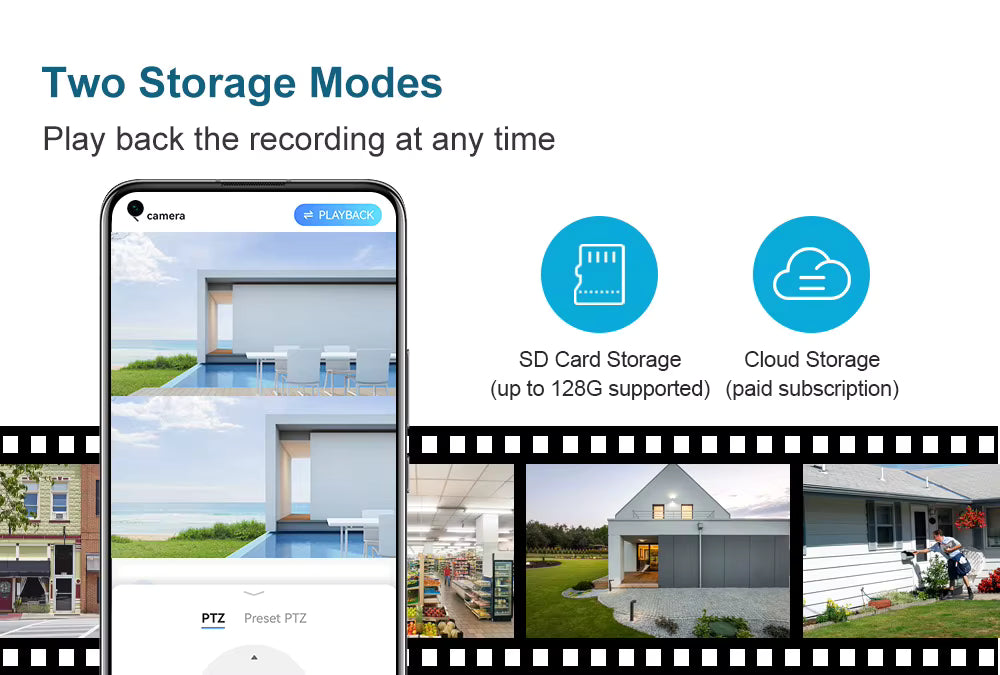 Stockage flexible : carte micro‑SD jusqu'à 128 Go + sauvegarde cloud via l'application V380 Pro