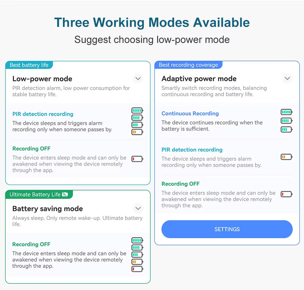 Avec un indice d'étanchéité IP66, elle résiste aux intempéries (pluie, poussière, températures −30 °C à +60 °C). Pour le stockage : carte micro‑SD jusqu'à 128 Go + option cloud via application.